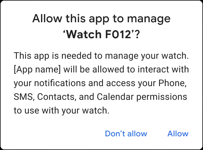 对于以 Android 12(API 级别 31)及更高版本为目标平台的合作伙伴应用,可以在连接到手表时使用配套设备配置文件。使用配置文件可将一组设备类型专用权限的授予操作捆绑在一个步骤中,从而简化注册过程。