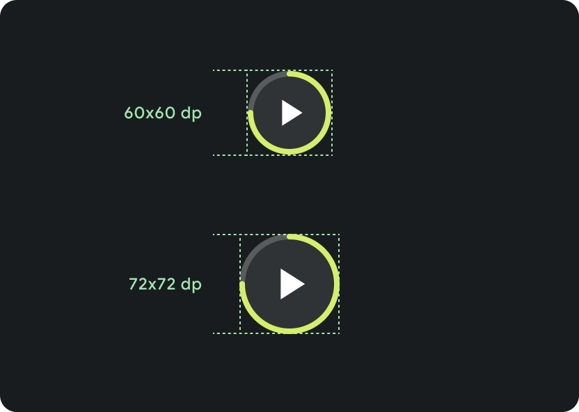 - 下部のボタンの最小タップ ターゲットは 48 dp(H)x 48 dp(W)にする必要があります。