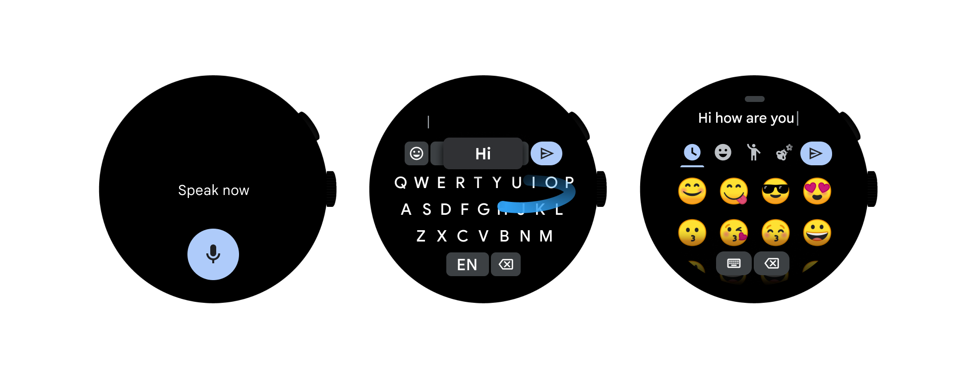 Wear OS از روشهای ورودی فراتر از صدا با گسترش چارچوب ویرایشگر روش ورودی Android (IME) پشتیبانی میکند. چارچوب IME از صفحهکلیدهای مجازی روی صفحه پشتیبانی میکند که به کاربران اجازه میدهد متن را به شکل کلیکهای کلیدی، دستنویس یا ژستها وارد کنند.