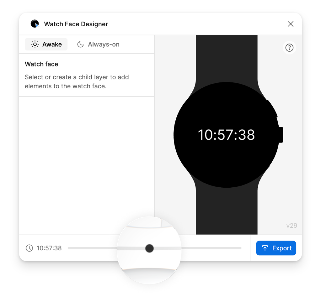 Wenn Sie sich Ihr Zifferblatt zu verschiedenen Tageszeiten ansehen möchten, können Sie die Uhrzeit der Vorschau anpassen, indem Sie den Schieberegler unten im Fenster Watch Face Designer ziehen: