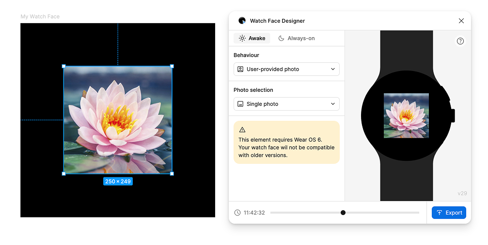 Pour prendre en charge les photos personnalisées, ajoutez un calque à votre cadran et définissez son comportement sur "Photo fournie par l'utilisateur". Pour cet exemple, nous utilisons une photo de fleur comme image par défaut pour ce calque. Cette image est utilisée par défaut avant que l'utilisateur n'ait attribué sa propre photo ou lorsqu'il choisit de ne pas utiliser l'une de ses photos.