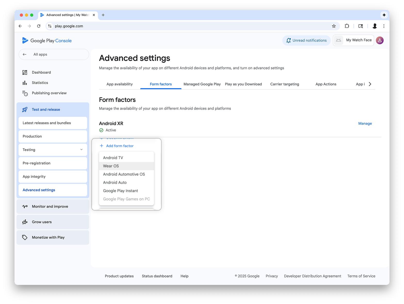 在页面右上角的下拉菜单中,选择管理设备规格,然后为您的应用添加 Wear OS 作为设备规格: