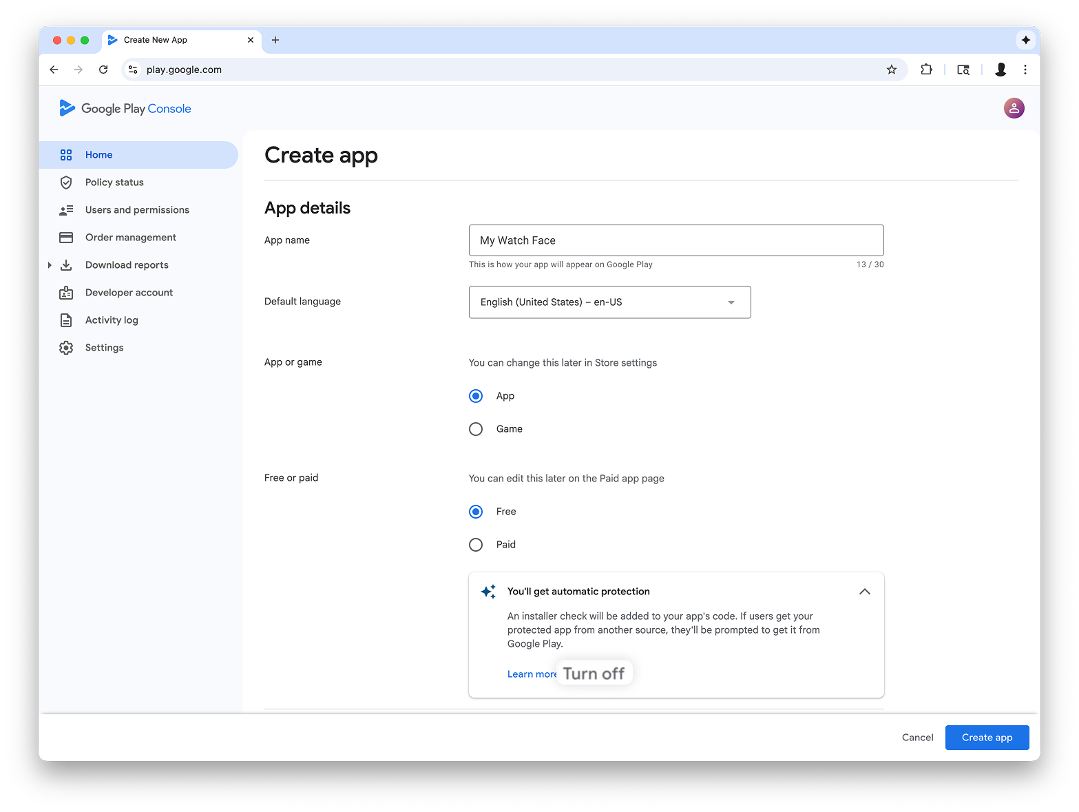 在“创建应用”工作流中,在系统提示时关闭自动保护功能;否则,您稍后将无法为 bundle 签名。自动保护功能与表盘无关,因为表盘没有任何代码。