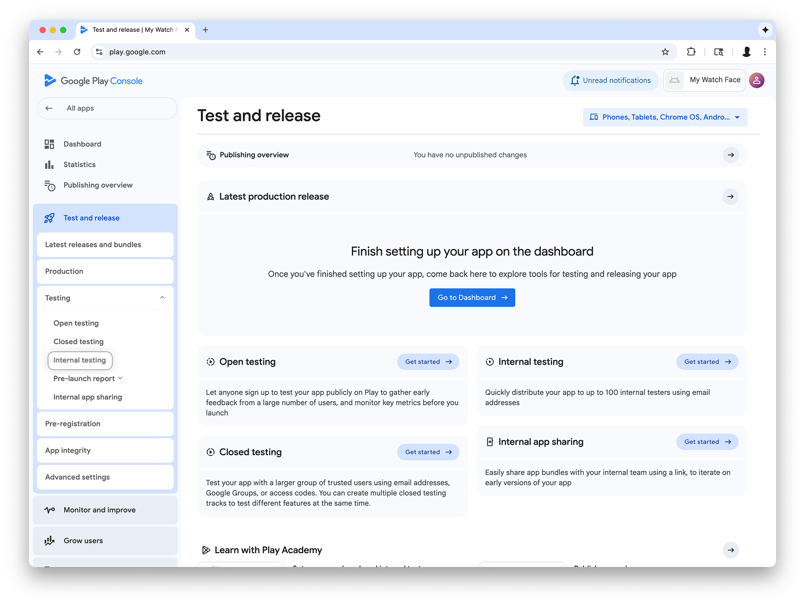 返回到内部测试菜单,然后创建仅限 Wear OS 的内部测试轨道。然后,创建版本: