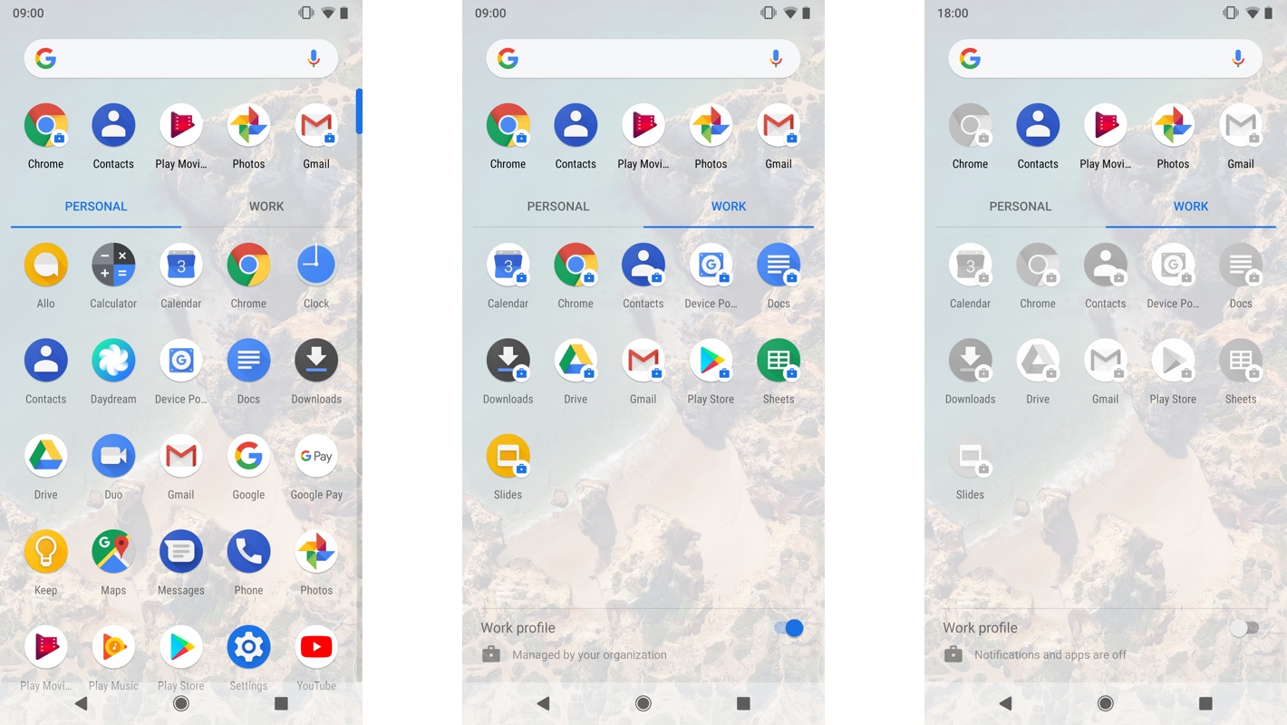 Android 9 (poziom interfejsu API 28) domyślnie uwzględnia zmiany w interfejsie Menu z aplikacjami ułatwiające użytkownikom oddzielenie aplikacji osobistych od służbowych. Producenci urządzeń i może przedstawiać użytkownikom na osobnych kartach do pracy i osobistych. Ułatwiliśmy też użytkownikom urządzeń włączanie i wyłączanie profilu służbowego przez w tym przełącznik na karcie Praca w programie uruchamiającym.